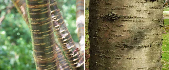Сакура имеет красивую декоративную кору, гладкую и отмеченную чечевичками (поры на коре, которые обеспечивают газообмен между атмосферой и растением), которые представлены горизонтальными полосами. Ветви цветущего дерева «Кодзё-но-май» (Kojo No Mai) искривлены: они растут зигзагообразно. Некоторые виды, например, Prunus serrula или Prunus maackii, имеют очень оригинальную кору.
