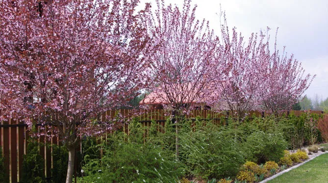 Можно посадить сакуру в кустовую клумбу или живую изгородь вместе с декоративно-лиственными или весенне-цветущими растениями. Посадить ее можно рядом с: