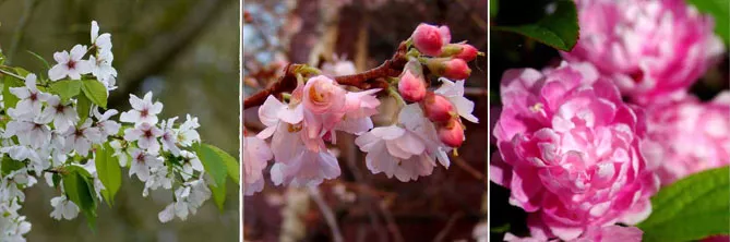 Фото. Цветы разных сортов сакуры: «Амаги-Йошино» (P. serrulata ‘Amagi Yoshino’), «Отумналис Розеа» (P. x subhirtella ‘Autumnalis Rosea’), и «Розеа Плена» (P. glandulosa ‘Rosea Plena’)