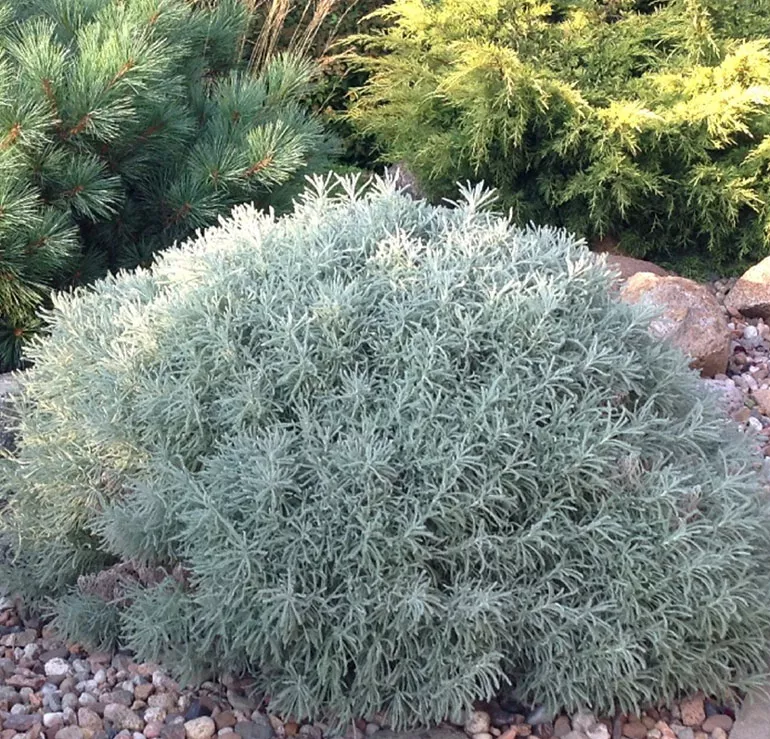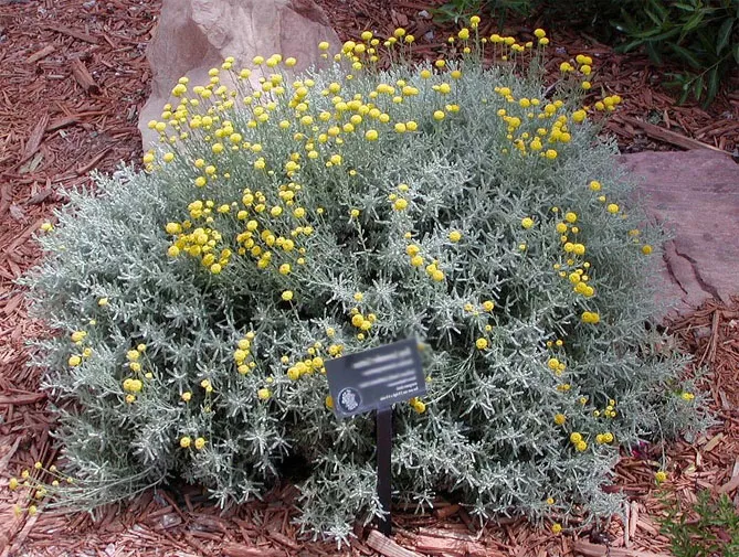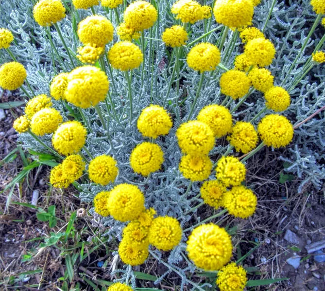 - Santa «Санта» – сантолина с круглыми кустиками высотой 25-40 см, листья — серо-серебристые, перистые, цветки – шаровидные желтые. Высаживают в солнечных местах.
