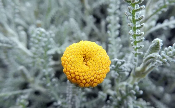 Сантолина – фантастическое растение. Оно приятно пахнет заморскими специями, имеет замысловатые листья и веточки, идеально подходит для засушливых мест, отпугивает насекомых, цветет милыми миниатюрными цветочками, которые очень красиво смотрятся на сером фоне. Красота сантолины заключается в ее цвете, форме веточек и аромате.