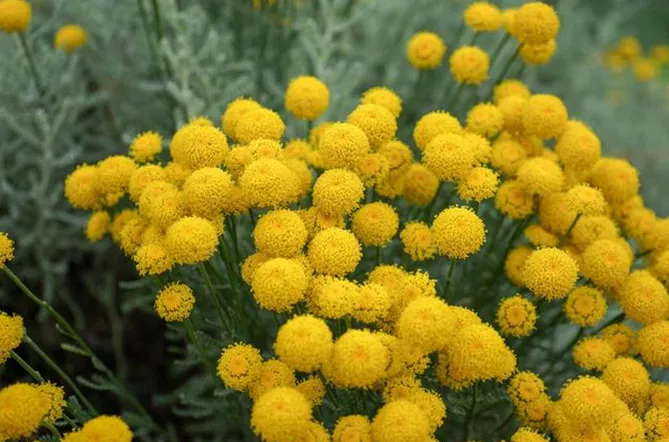 Цветет сантолина кипарисовидная в начале лета – в июне-июле на верхушках тонких, жестких стеблей появляются желтые цветки, состоящие исключительно из трубчатых цветков. Они напоминают полукруглые «пуговицы», возвышающиеся над серебристым пучком листьев. Из-за их интенсивно желтого цвета и сферической, пуговичной формы цветы выглядят чрезвычайно очаровательно на фоне серо-зеленой листвы.