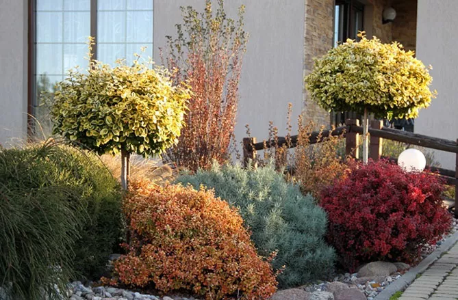 - Кустарник может быть хорошо представлен в композициях с другими декоративными растениями: