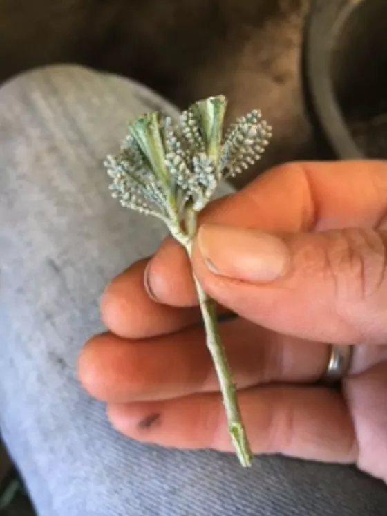 - Листья – маленькие, многочисленные, перистые, скрученные, сильно извилистые, ароматические, покрыты мягким серебристо-серым пушком (вблизи листья выглядят как ощетинившиеся и колючие на самом деле они мягкие, нежные на ощупь).