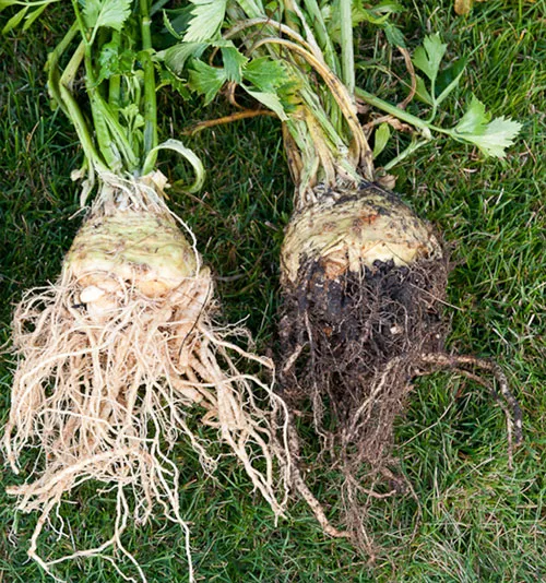 Однако, слишком быстрый рост растений, стимулируемый избыточным орошением, повышает восприимчивость сельдерея к образованию пустот в корнях. Большие колебания в снабжении растений водой могут быть одной из причин гниения листьев и отмирания вершин роста растений.