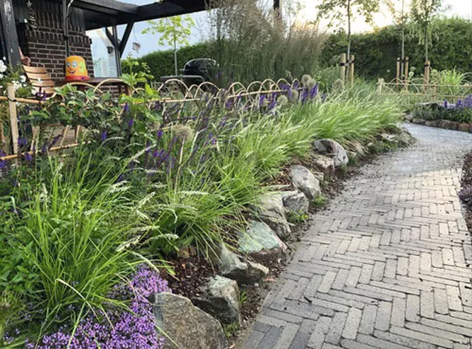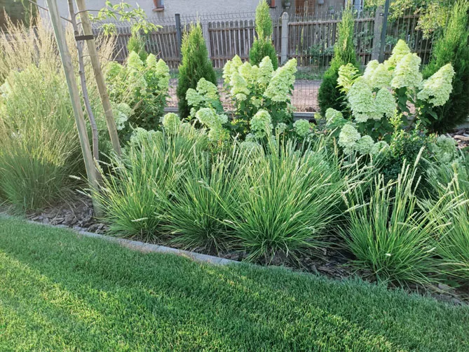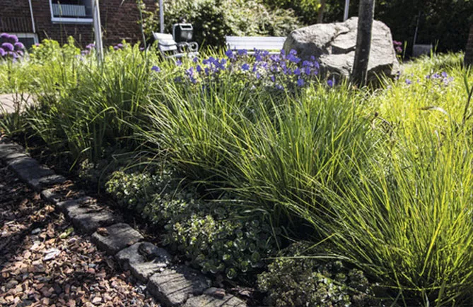 В лаконичном декоре в очень современном стиле сеслерию можно дополнить растениями, популярными в современном ландшафте: