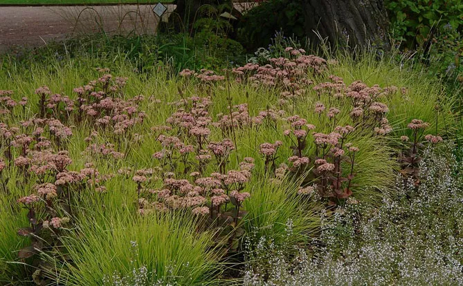 В натуралистическом массиве трава будет хорошо смотреться с другими многолетниками с летним цветением: