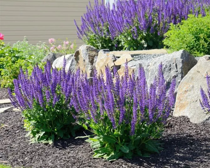 На рубеже мая и июня шалфей цветет, создавая эффектные соцветия, несколько напоминающие люпины или гиацинты. В зависимости от сорта цветы могут быть голубыми, фиолетовыми, розовыми, кирпично-красными или белыми, в начале лета украшая клумбы, рокарии, склоны или холмы в саду.