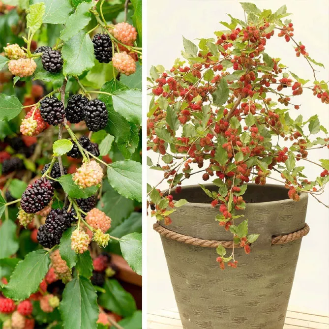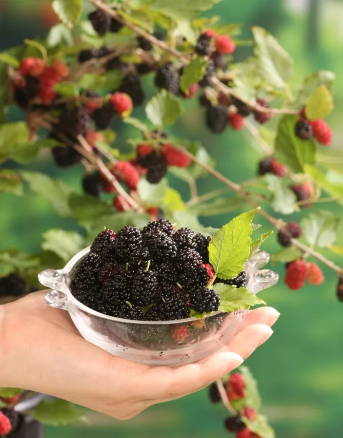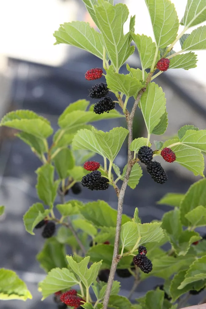 - Шелковица карликовая «Моджо Берри» Mojo Berry принадлежит виду Morus rotundiloba. Это недавно появившийся сорт, образующий густой куст компактного размера, идеально подходящий также для выращивания в горшках на террасе, балконе. Куст способен плодоносить на однолетней древесине (молодых побегах предыдущего сезона), дает плоды с лета до осени. Удивительно простой в уходе сорт, выносливый, очень устойчив к болезням. Период цветения: апрель-август. Высота дерева в зрелом возрасте – 1,5 м.