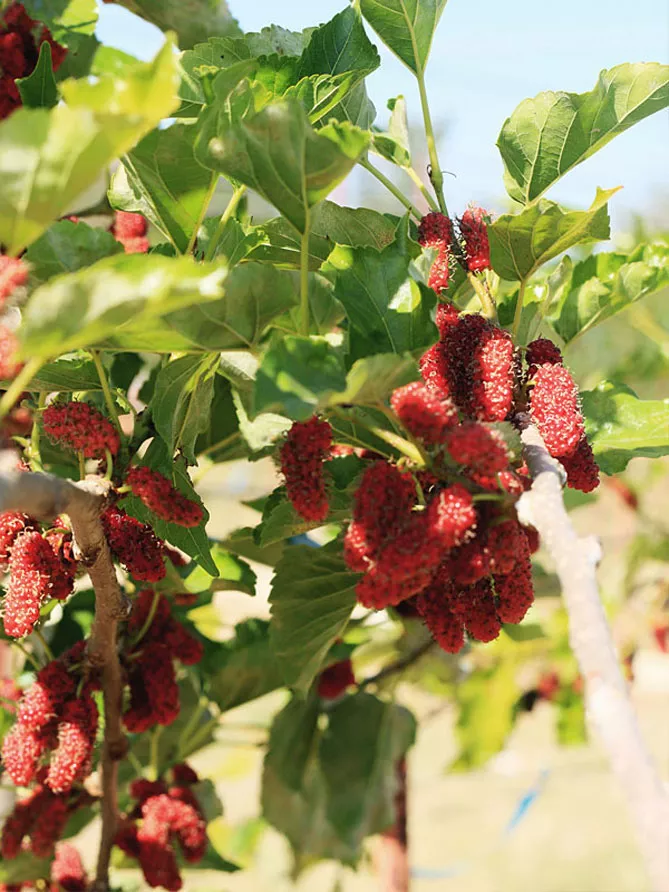 Чтобы собрать плоды шелковицы, просто натяните ткань под деревом и осторожно встряхните его.