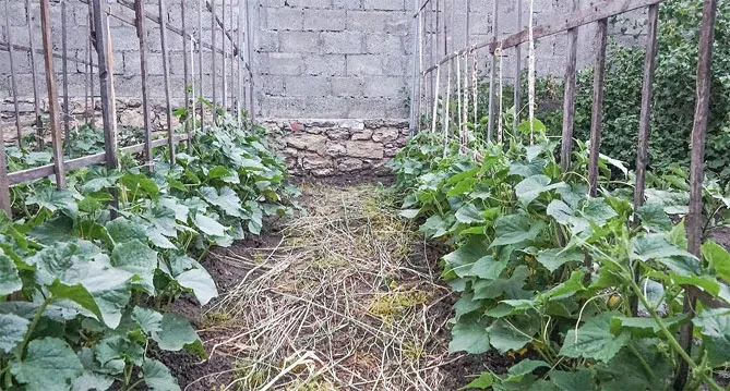 - На проволоке. В концах грядки, где высажены в 2 ряда огурцы, закапывают по 2 полутораметровых столба, между ними натягивают 2 ряда проволоки. К каждому растению первого ряда привязывают шпагат, перекидывают его через 2 ряда проволок и привязывают к растениям соседнего ряда. В итоге получается зелёный шалаш.