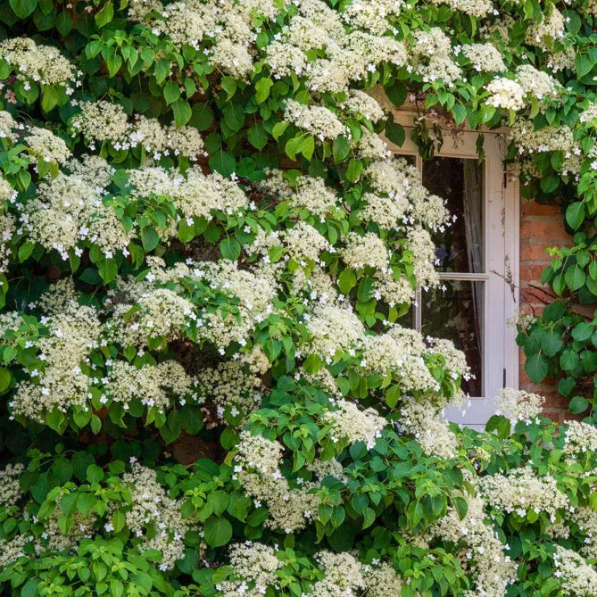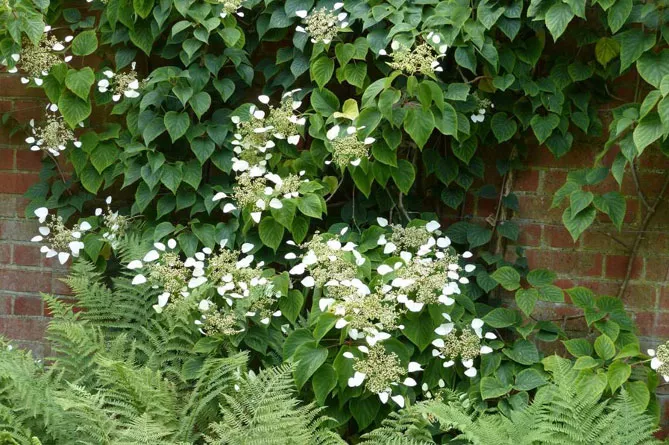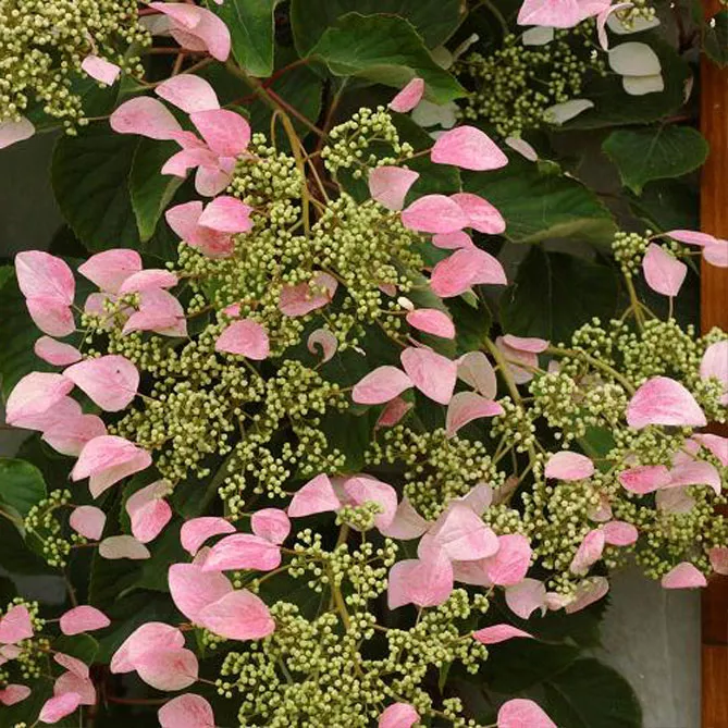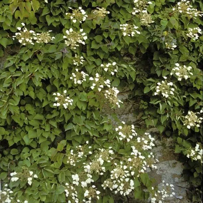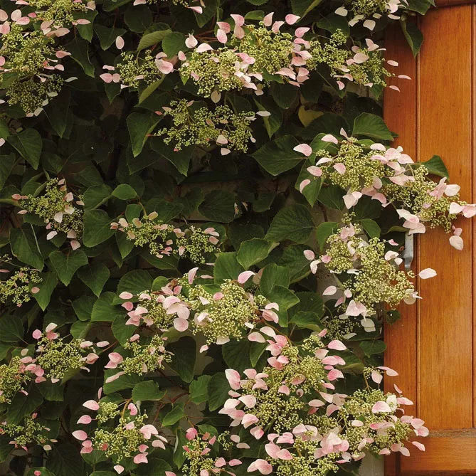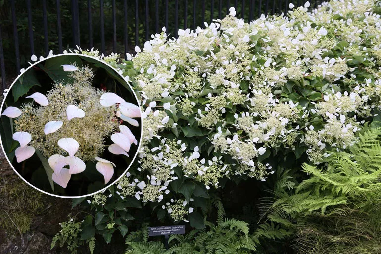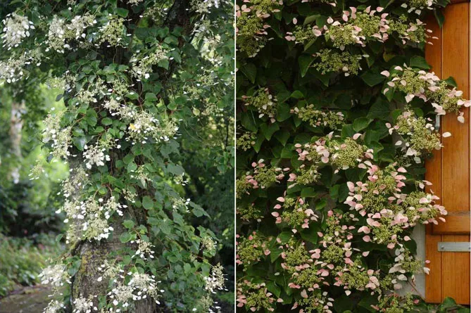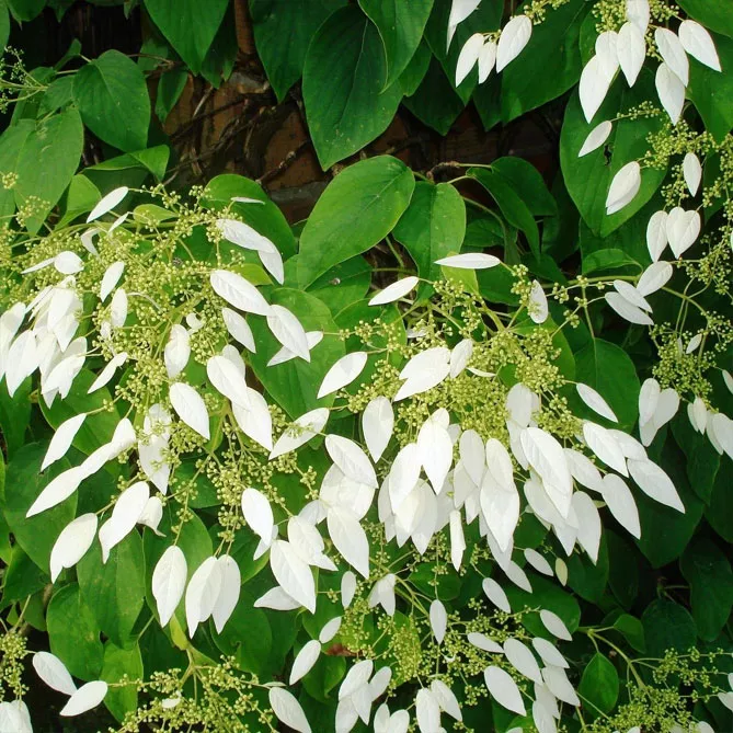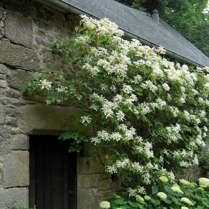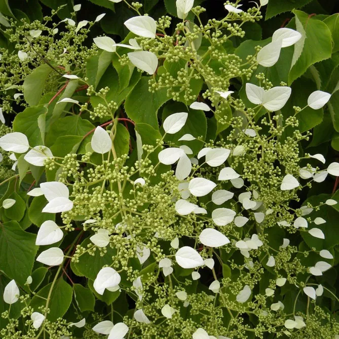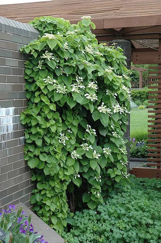 Довольно близкая по внешнему виду к гортензии вьющейся (черешковой) и часто путаемая с ней, эта «ложная вьющаяся гортензия» предлагает более эффектное цветение, которое может длиться до 3 недель.