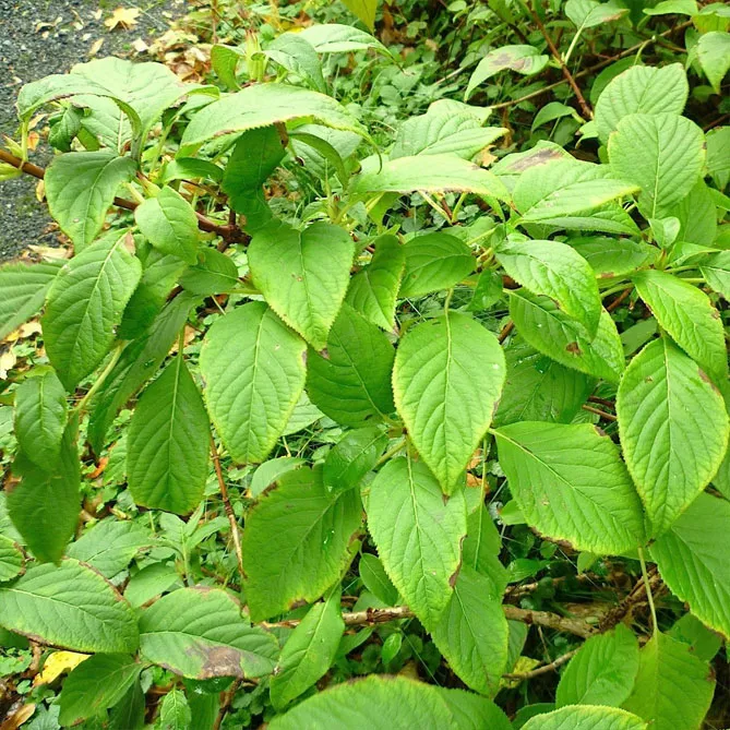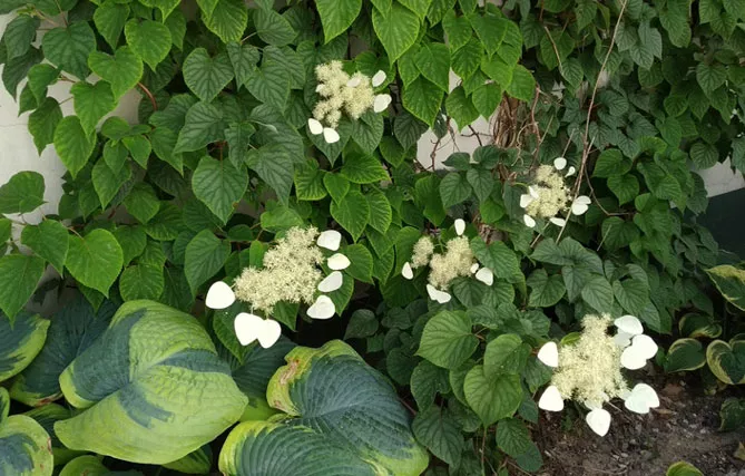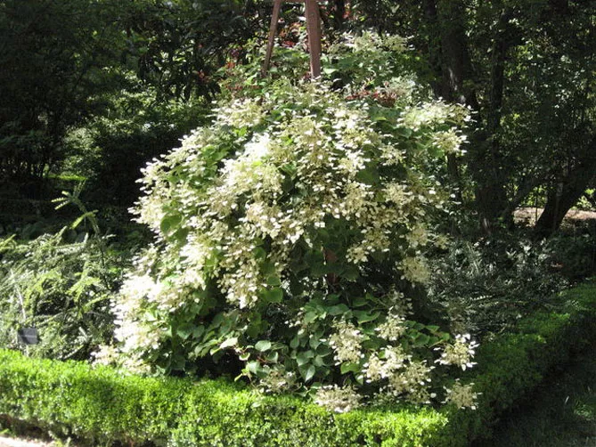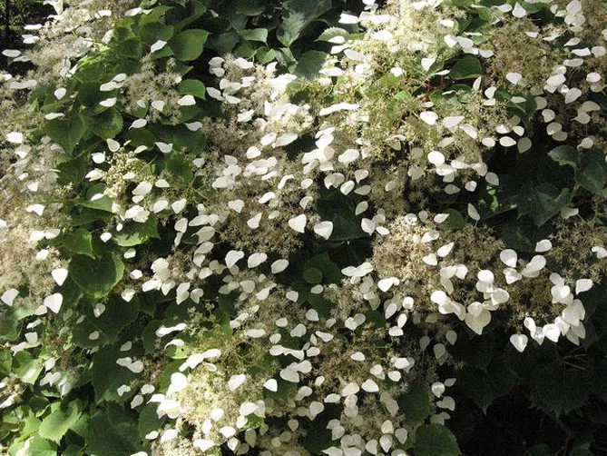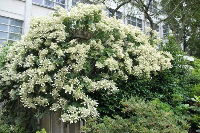 Схизофрагма лещинолистная (Schizophragma corylifolium) – самый ранний вид, цветет в конце весны или начале лета (обычно с мая по июль). Светло-зеленая листва похожа на листья лещины, отсюда и название. Кремовые цветы придают кустарнику естественное, романтическое очарование. Достигает 4 м.