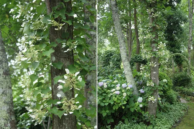 Фото. Пример комбинации в подлеске: схизофрагма гортензиевидная взбирается на дерево с гортензией крупнолистной у его основания и ковром из яснотки в качестве почвенного покрова.