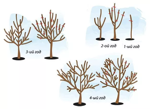 У саженцев сорта Шрифель возрастом 2 или 3 года формируют крону. Для этого центральный ствол укорачивают так, что он был выше основных побегов на 15 см, длину которых уменьшают на треть. Яблони сорта Штрифель формируют ярусами, между которыми оставляют 60 см. Они состоят из 2 или 3 скелетных веток. Сухие побеги и те, что располагаются под острым наклоном к стволу, удаляют.