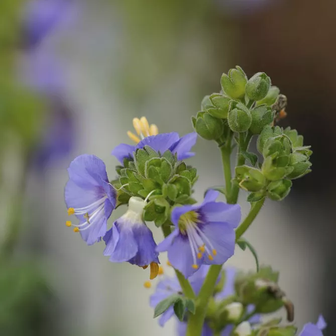 Синюха северная (лат. Polemonium boreale) – вид родом из Северной Америки. Компактный многолетник образует небольшой темно-зеленый куст, из которого выходят прямостоячие стебли с маленькими фиолетово-голубыми цветками, освещенными нежно-желтыми глазками. Высота: 25-30 см. Цветет с июня по август.