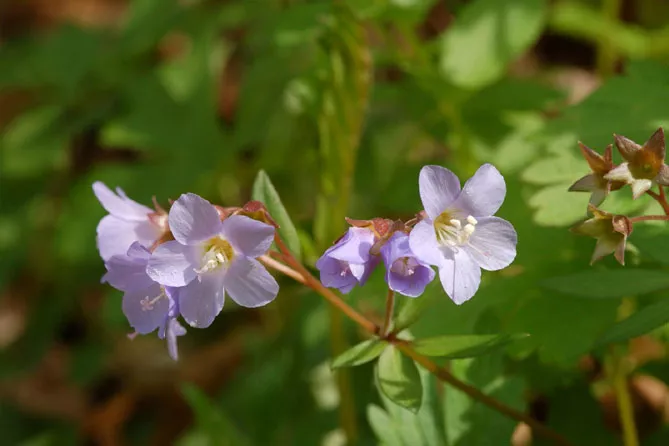 Синюха ползучая (Polemonium reptans) – вид с довольно широкими стеблями длиной 40 см, которые весной украшают плотные букеты пурпурно-синих колокольчатых цветов. Цветение: май-июнь.