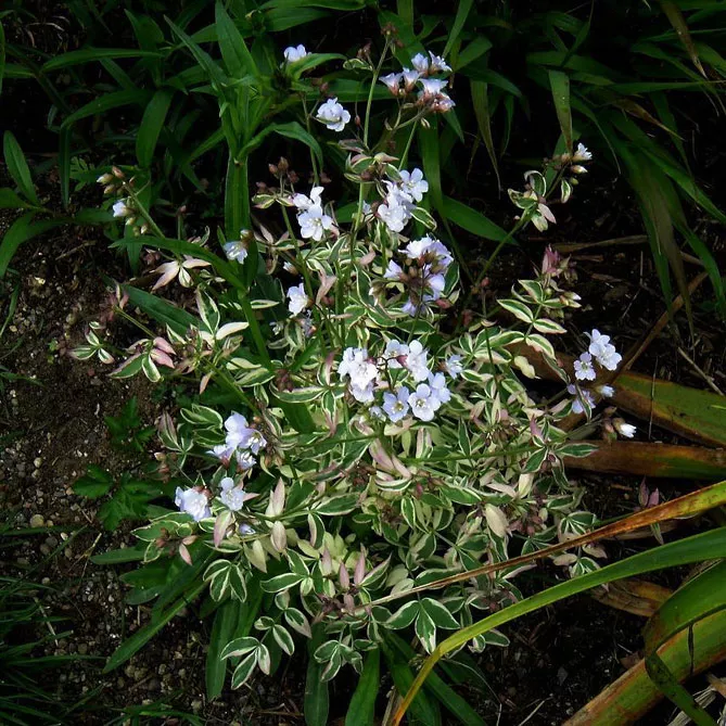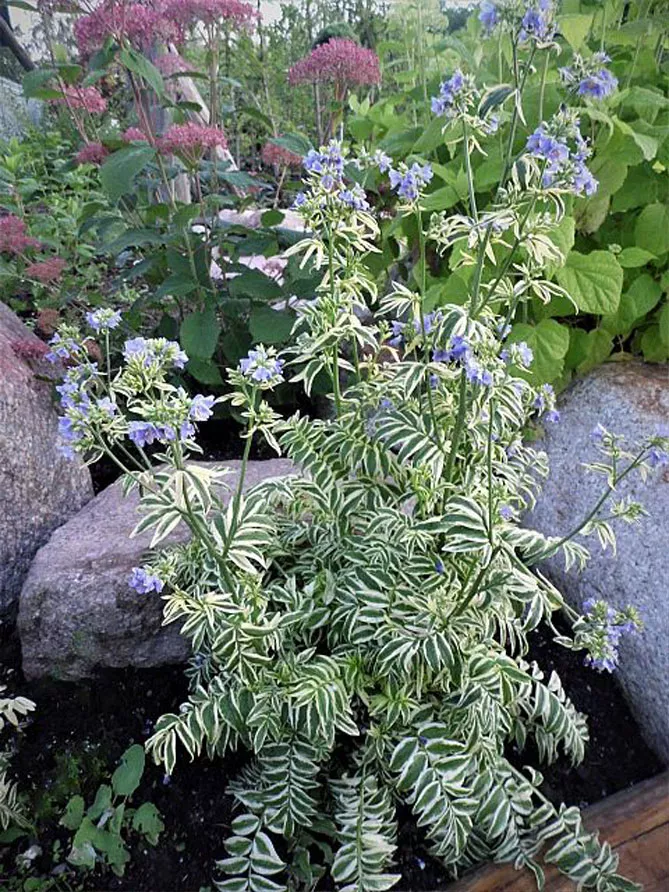 - «Лестница в небеса» Stairway to heavens. Сорт отличается бледно-голубыми цветами, цветущими в мае-июне и великолепной пестрой листвой. Высота растения: 40 см.