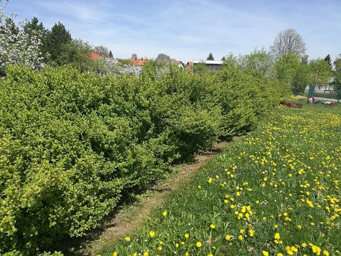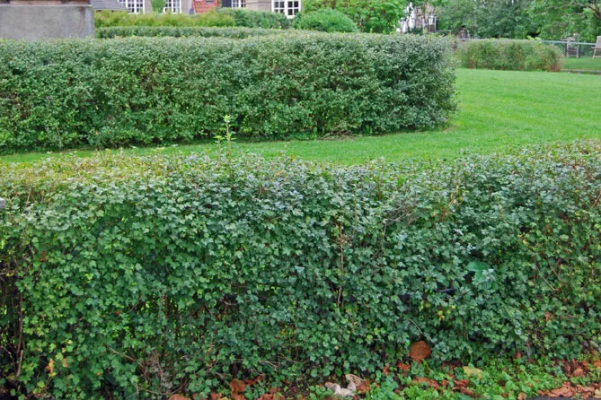 - Высаживая живую изгородь, которая будет ограничена обрезкой, соблюдайте правильные расстояния между растениями. Они должны достигать 30-50 см, в то время как для необрезаемой (неформируемой) изгороди расстояния между растениями должны быть больше. Стоит отметить, что альпийский вид смородины хорошо переносит компанию других растений, в том числе деревьев с развитой корневой системой. Смородина отлично подходит для групповых посадок.