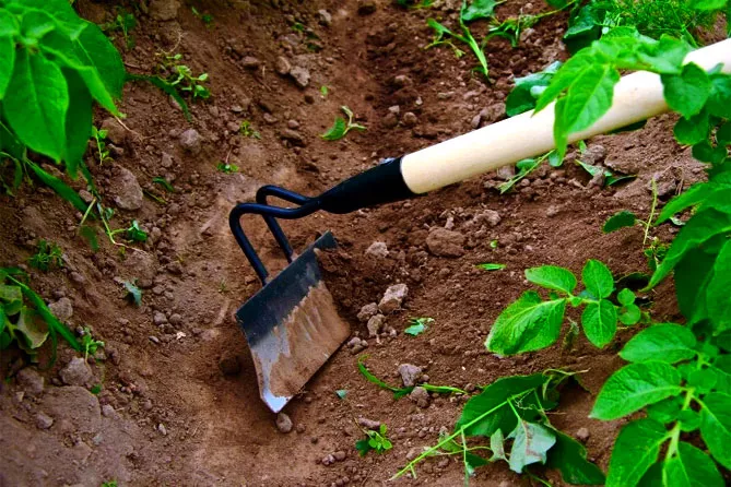 Когда выполняются рыхления, нужно одновременно производить окучивание кустов. Для этого землю надвигают к основанию куста при помощи мотыги (цапки). На чернозёмных почвах окучивание выполняют дважды за сезон. Благодаря этому агроприёму, увеличивается количество корней у картофеля и возрастает урожайность.