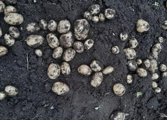 Выкопку проводят вилами или лопатой, некоторые дачники при значительных площадях посадки используют для копки мотоблок. Клубни 2-3 часа подсушивают на грядках, затем на 2 недели переносят под навес или в хорошо проветриваемое помещение. Картофель готов к хранению.
