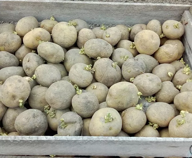 Проращивание клубней Крепыша начинают примерно за месяц до посадки. Для этого их раскладывают в ящики и переносят в светлое помещение с температурой 16-18 °C. Прорастающий картофель должен быть на свету, тогда ростки будут крепкими, в меру развитыми, клубни позеленятся.
