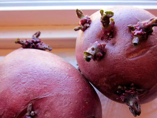 - Озеленение посадочного материала. За месяц до высадки картофель нужно вытащить из, овощехранилищ и разложить на свету. Температуру в помещении поддерживают на уровне 10-12 градусов. На солнечных лучах картофельные ростки зазеленеют и пойдут в рост. Для употребления в пищу позеленевший картофель непригоден, но прекрасно подготовлен к посадке – соланин защищает от болезней.