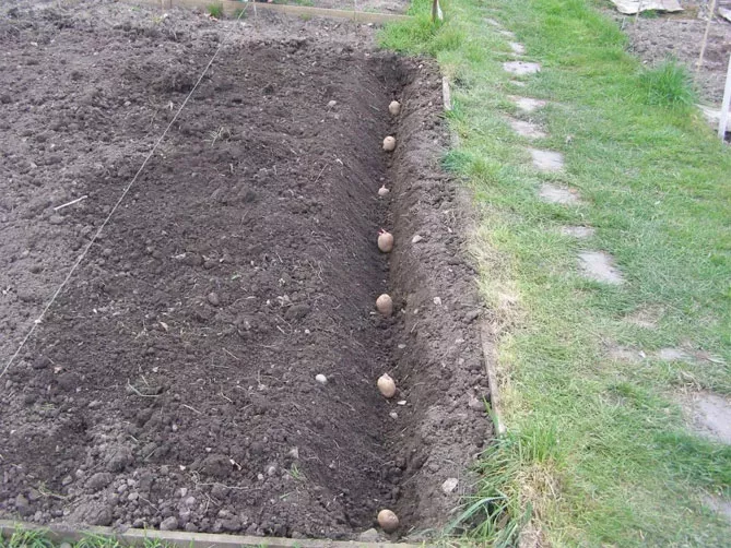 Расстояние между ямками при посадке раннего картофеля составляет 25-35 см, ряды должны отстоять друг от друга на 50-60 см.