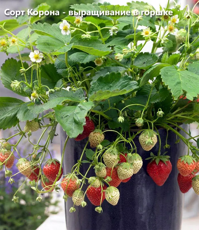 Клубника Корона по описанию и отзывам, считается среднеспелым сортом садовой земляники. Кусты земляники мощные, средней облиственности. Листья крупные, цветоносы большие.