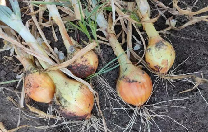 Уборку урожая начинают, когда ботва начнет желтеть и полегать, шейка луковицы подсохнет и станет тоньше. Погода обязательно должна быть сухая. Луковицы выкапывают, стараясь не наносить повреждения, отряхивают от земли и оставляют на грядке до конца дня. Затем раскладывают под навесом в хорошо продуваемом месте для просушки.