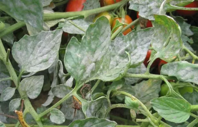 Развитие болезни начинается с нижних листьев, на них появляется характерный белый налет. При дальнейшем прогрессировании болезнь распространяется выше. Затем места покрытые налетом желтеют и отмирают. Основная причина возникновения мучнистой росы высокая влажность и отсутствие проветривания. Для лечения используют растворы медьсодержащих фунгицидов.