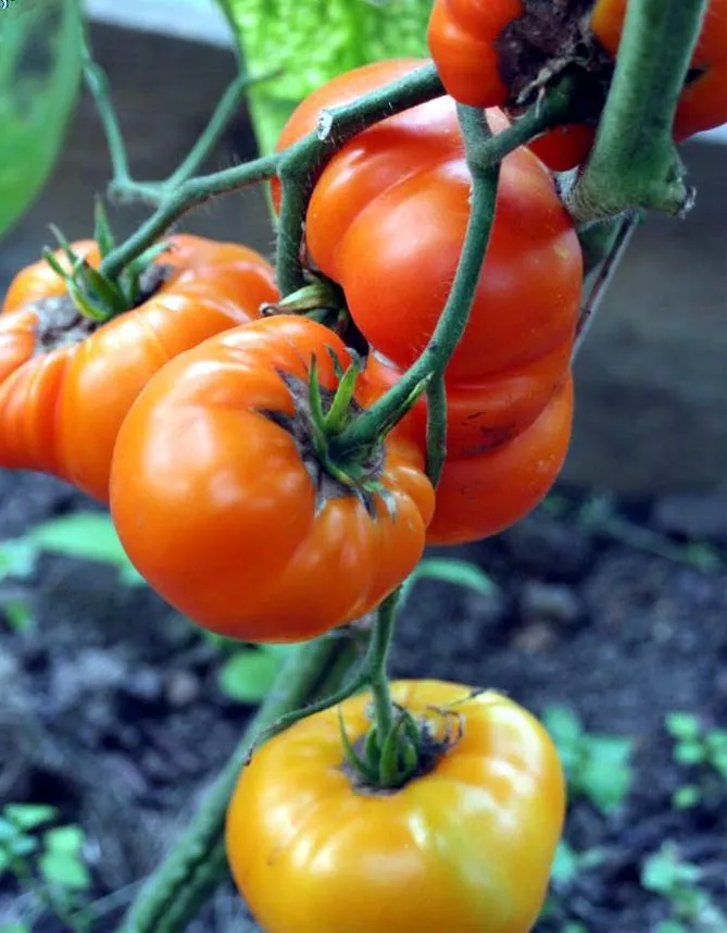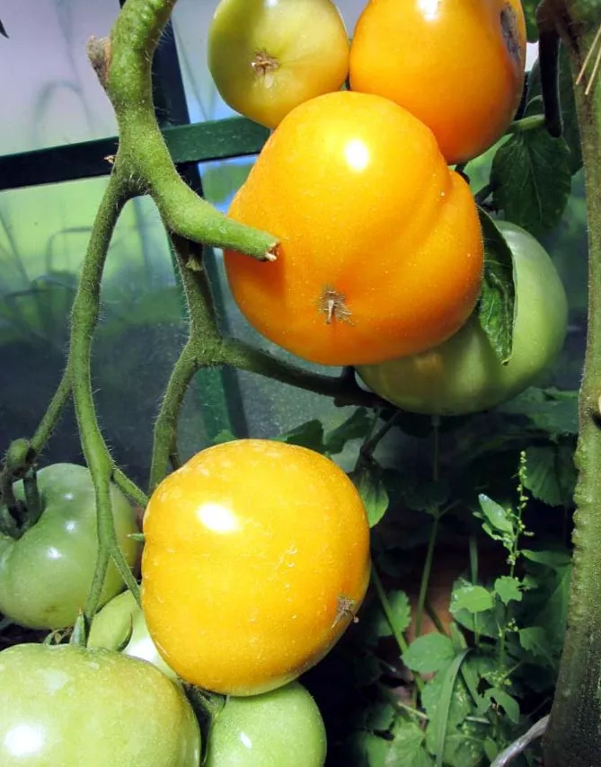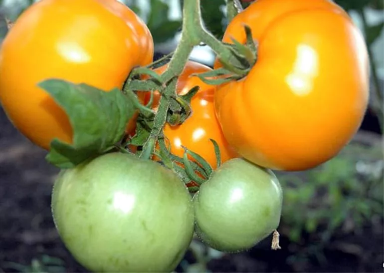 Если на жёлто-оранжевом томате присутствует зелёное пятно возле плодоножки, значит, он созрел не полностью. При необходимости помидоры снимают с куста и оставляют дозревать в тёмном месте.