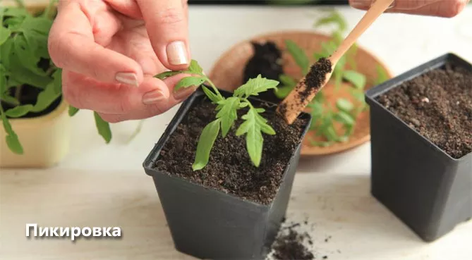 После появления второго настоящего листа сеянцы пикируют в просторные ящики или отдельные емкости. После пикировки рассаду на 2-3 дня притеняют. Через неделю распикированные помидоры подкармливают универсальным удобрением «Для рассады». Дальнейший уход за рассадой заключается в периодических поливах, рыхлении почвы.