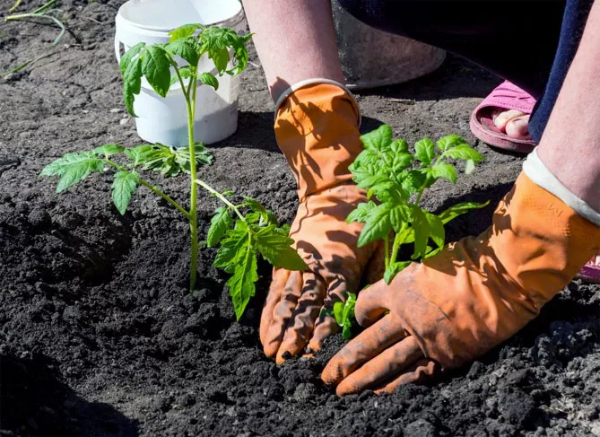 - Через 10 дней после высадки на постоянное место томаты подкармливают раствором мочевины с гуматом калия. Норму внесения удобрений можно найти на упаковке. В зависимости от производителя она может разниться.