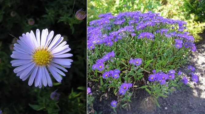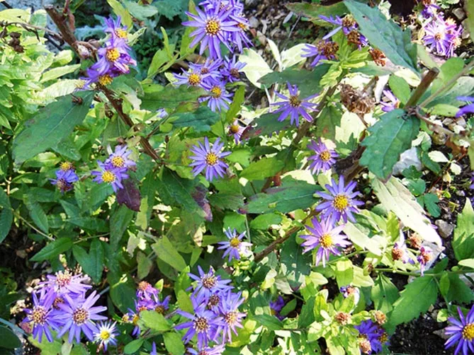 Привлекательную листву имеют многолетние вересковые сорта (Aster ericoides). У этого вида сильно разветвленные побеги и листья узкие, как иглы. Цветет в октябре, покрываясь множеством маленьких белых цветов, украшает сад до мороза.
