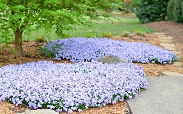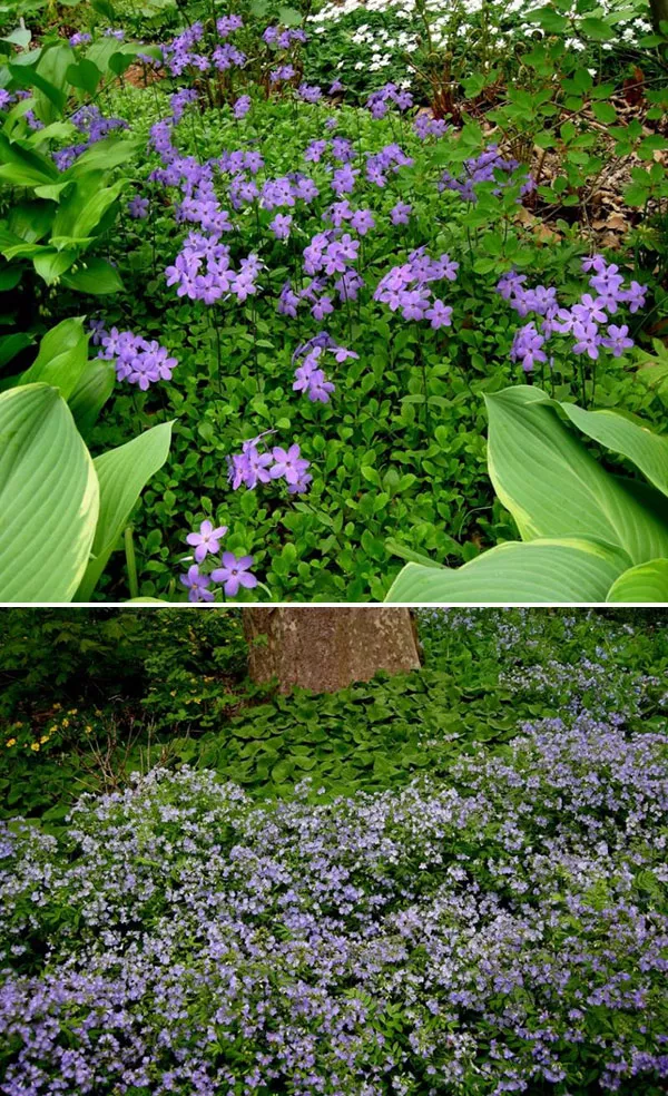 Отличное многолетнее почвопокровное растение – Phlox stolonifera – флокс столоносный или ползучий. С апреля по июнь облако голубо-сиреневых, сильно ароматных цветов поднимается над подушками из плотных лопаточных листьев. Они растут на длинных стеблях, пятилопастные, одинарные с контрастными оранжевыми тычинками. Цветки такие же крупные, как у метельчатых флоксов. Дополнительное преимущество растения – вечнозеленые листья, благодаря которым клумба не пустует в межсезонье.