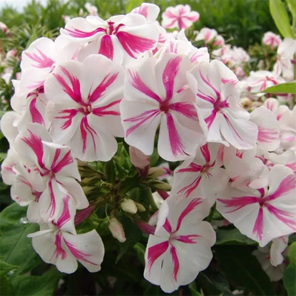 - «Наташа» – сорт пятнистого флокса с двухцветными цветками. Цветет с июня по август, образуя длинные цилиндрические куполообразные метелки из бело-малиново-розовых цветов. Вырастает до 60-90 см.