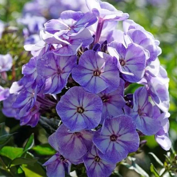 - Сорт голубых флоксов «Голубой рай» Blue Paradise. Интересный, достаточно высокий (80-100 см) сорт с голубыми цветками с пурпурным оттенком. Метельчатые ароматные соцветия появляются с июля по сентябрь. Окраска лепестков варьируется в зависимости от количества света и влажности воздуха. В солнечный полдень соцветия переливаются оттенками пурпурного, утром и вечером, когда меньше солнца, приобретают чудесный насыщенный голубой тон.