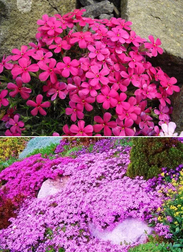 - «Алое пламя» Scarlet Flame – с весны до начала лета превращаются в цветущие розово-красные ковры, живописно струящиеся по клумбам. Цветки мелкие, с темным глазком, почти полностью закрывают темно-зеленые пучки листьев при распускании. Растение образует низкие коврики, отлично подходит для бордюров, клумб, дорожек, альпинариев. После цветения украшает сад плотным ковром зеленых побегов с короткими узкими игольчатыми листьями. Вырастает до 10-15 см, 60 см в ширину.