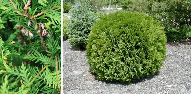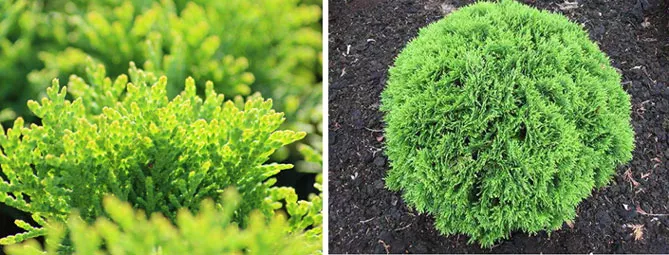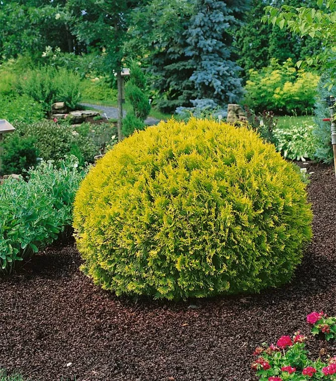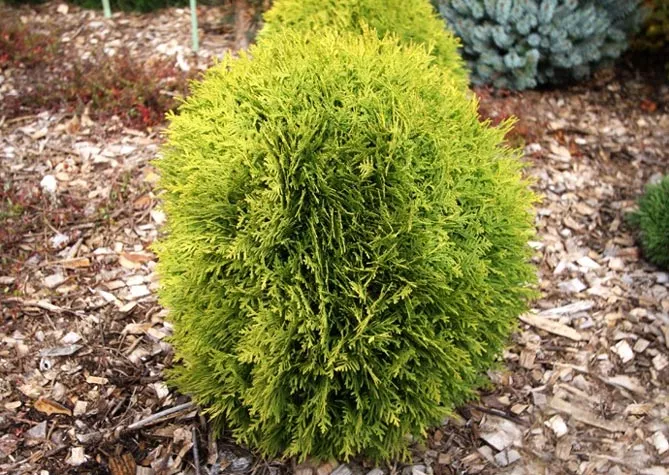 Золотой глобус – популярный сорт из Канады, характеризуется медленным ростом и уникальным стилем, цветом. Сорт создает восхитительный шар с блестящими золотисто-зелеными побегами.