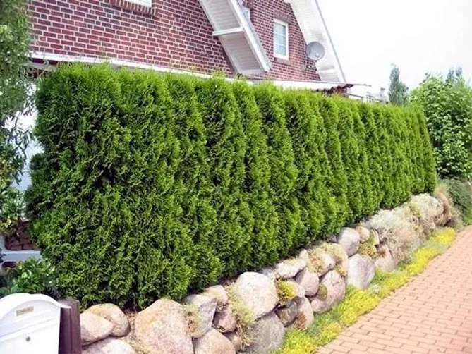Следует помнить: быстрорастущие сорта туи могут достигать большой высоты кроны – через несколько лет их придется обрезать. В противном случае растения могут быстро подняться по забору и стать высокими деревьями (даже более 10 м). Обрезка заставит растения хорошо расти и сформировать зеленую стену.