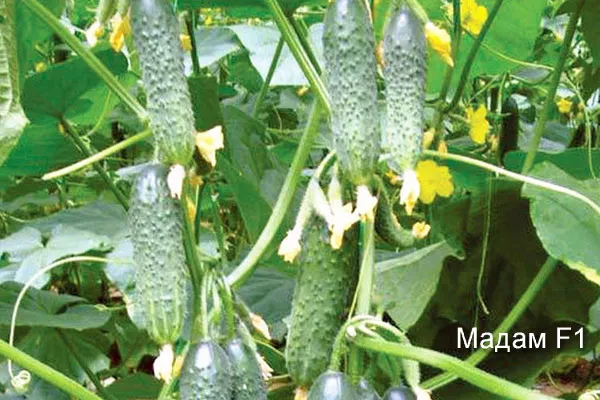 - Мадам. Необходимо опылять насекомыми для появления урожая. Огурцы отличаются устойчивостью к корневой гнили. Овощи не желтеют и вырастают стандартного размера. Могут применяться для засолки и салатов. Имеют приятный вкус, без горечи.