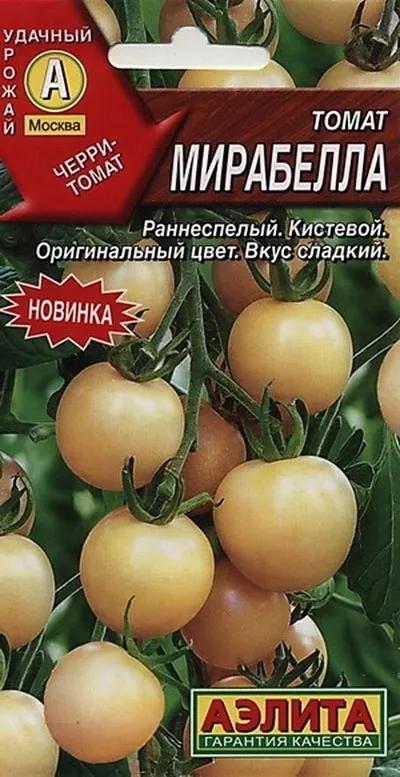 Сорт с жёлтовато-белыми томатами, созревающими на 4-й месяц посева. Каждый экземпляр по 20-30 г. Запах и вкус приятный. Высокорослые кусты (до 200 см) в тёплых районах можно культивировать без укрытия. «Мирабелла» устойчива к фитофторе.