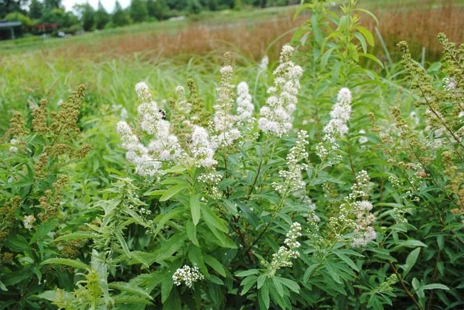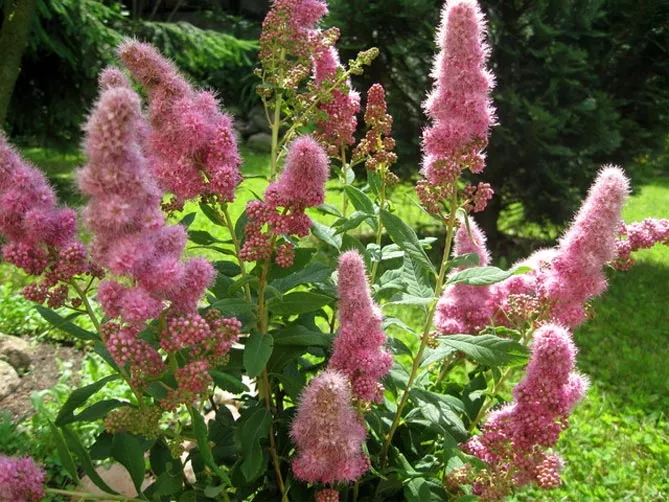 Spiraea salicifolia – Спирея иволистная обычно цветет в июне-июле. Ее можно найти в диком состоянии на влажных лугах и на сухих почвах. Вид очень неприхотлив, переносит практически все условия. Побеги жесткие, куст образует подземные столоны, благодаря которым растение быстро размножается. Высота: до 2 метров. Цветки, как правило, розовые, но встречаются и белые.