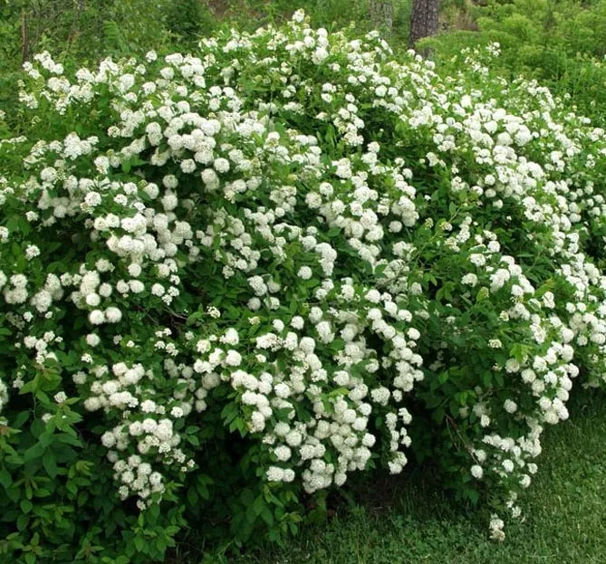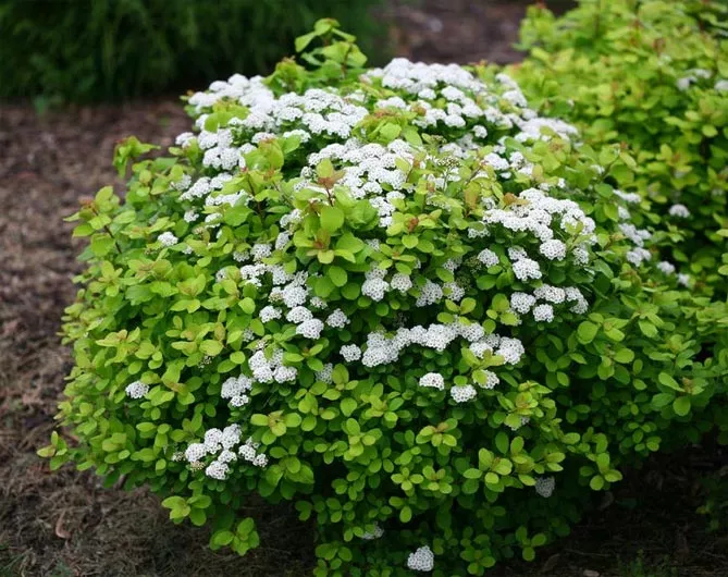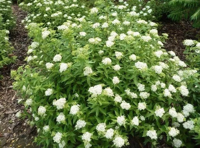 | «Пигмеа Альба» (Pygmaea Alba). Кустарник со сплюснутой сферической формой. Листья светло-зеленые. Белые цветы появляются в конце побегов этого года в июне-июле. | ![]() |