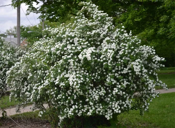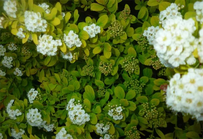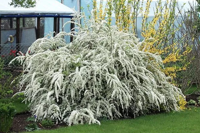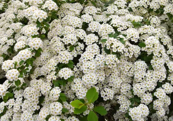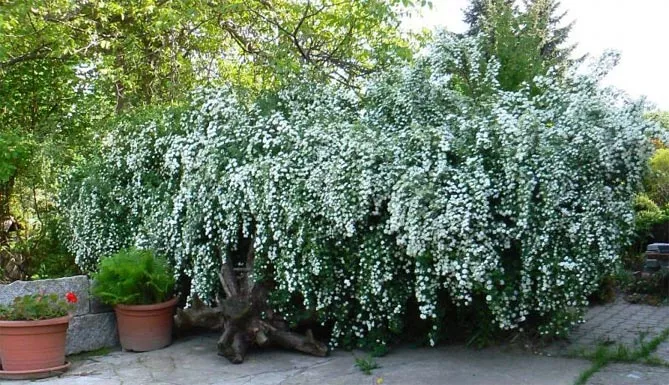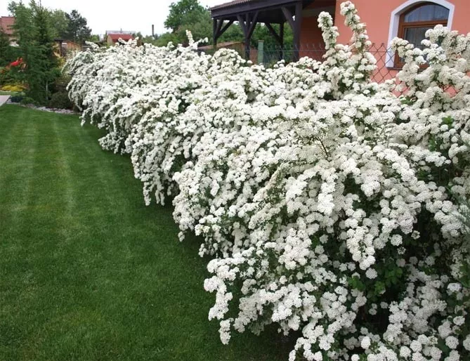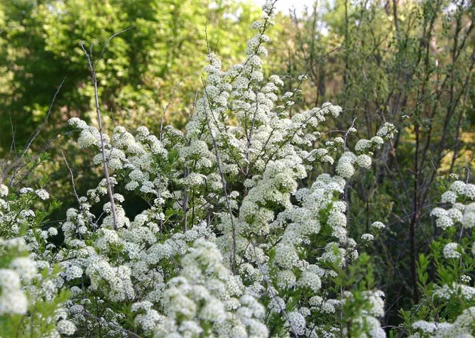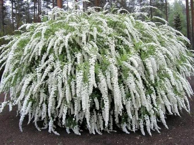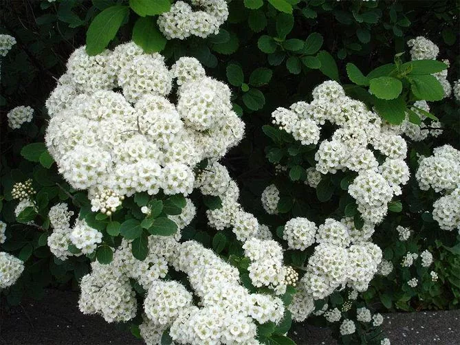 Spiraea × vanhouttei – спирея Вангутта образует великолепные кусты, достигающие 2,5 метров. Цветет в мае-июне. Цветы сохраняются в течение относительно долгого времени на кусте. Устойчив к морозу.