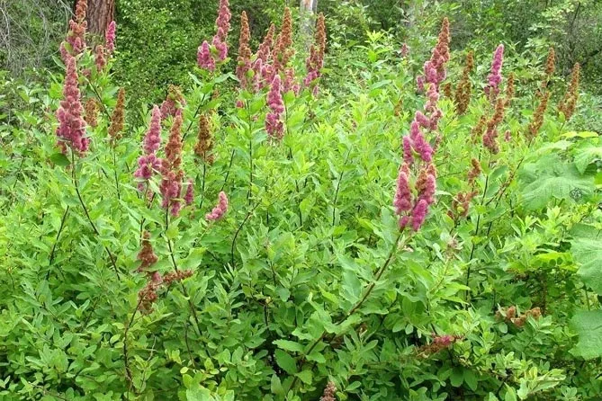 Spiraea douglasii – спирея Дугласа достигает высоты 1,5 м. Сорт быстро вступает в вегетационный период – листья появляются ранней весной. Куст формирует впечатляющие соцветия (длиной 20 см) розовые или фиолетовые. Цветет с июня по июль. Кустарник полностью морозостойкий. Хорошо подходит для создания несформированных изгородей из нескольких видов кустарников компактной формы.