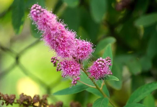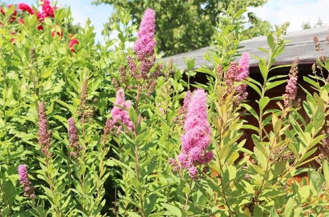 Spiraea billardii – Спирея Билларда вырастает до 2 метров, хорошо переносит засуху, суровые зимы. Цветки пурпурно-розовые, появляются в середине лета. Кустарник устойчив к загрязнению воздуха, почвы.