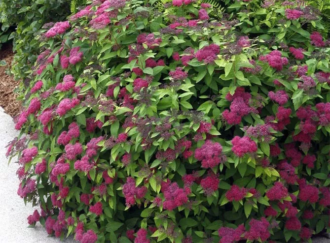 Spiraea densiflora (Спирея густоцветковая) – довольно низкий кустарник, вырастающий до 60 см в высоту. У растения причудливо изогнутые побеги красно-коричневого цвета и темно-зеленые, морщинистые листья, осенью меняющие цвет на оранжево-желтый. Куст выглядит наиболее красиво в июне-июле, когда появляются темно-розовые цветки, собранные в плотные зонтики, размещенные на верхушках побегов. Густоцветковая спирея устойчива к засухе, выращивается даже в прохладных регионах нашей страны, потому что не чувствительна к морозу. Эти кустарники идеально подходят для низких, необрезных живых изгородей.