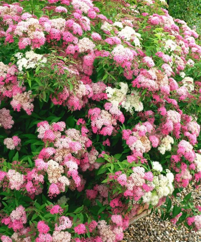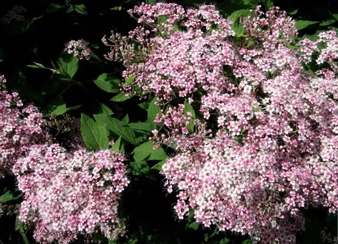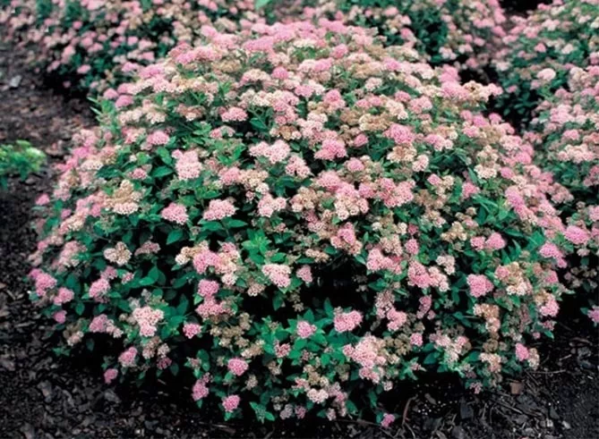 Японский вид спиреи цветет очень долго и обильно (с июня по сентябрь) и имеет цветки бледно-розового или темно-розового оттенка. Цветы появляются на верхушках однолетних побегов и собраны в довольно крупные и плоские соцветия.